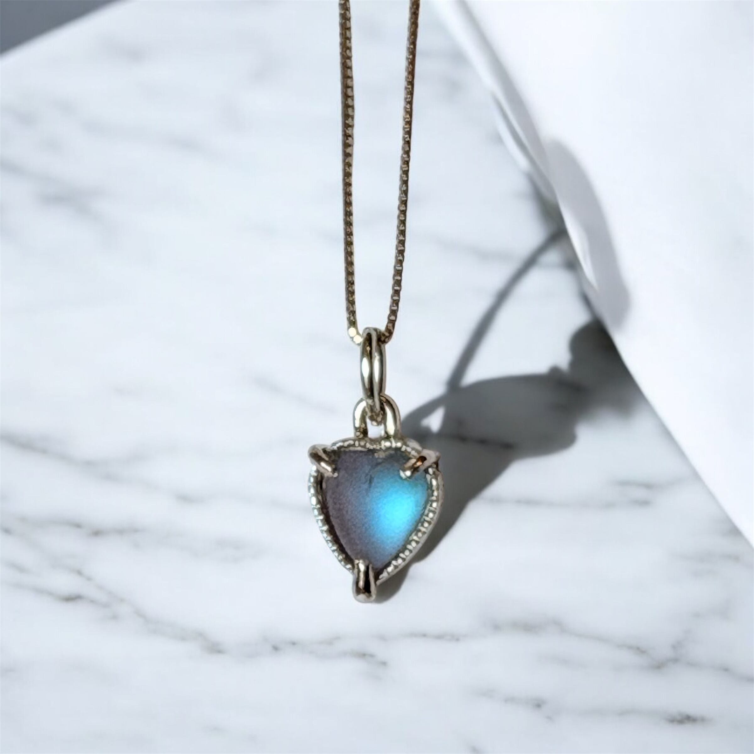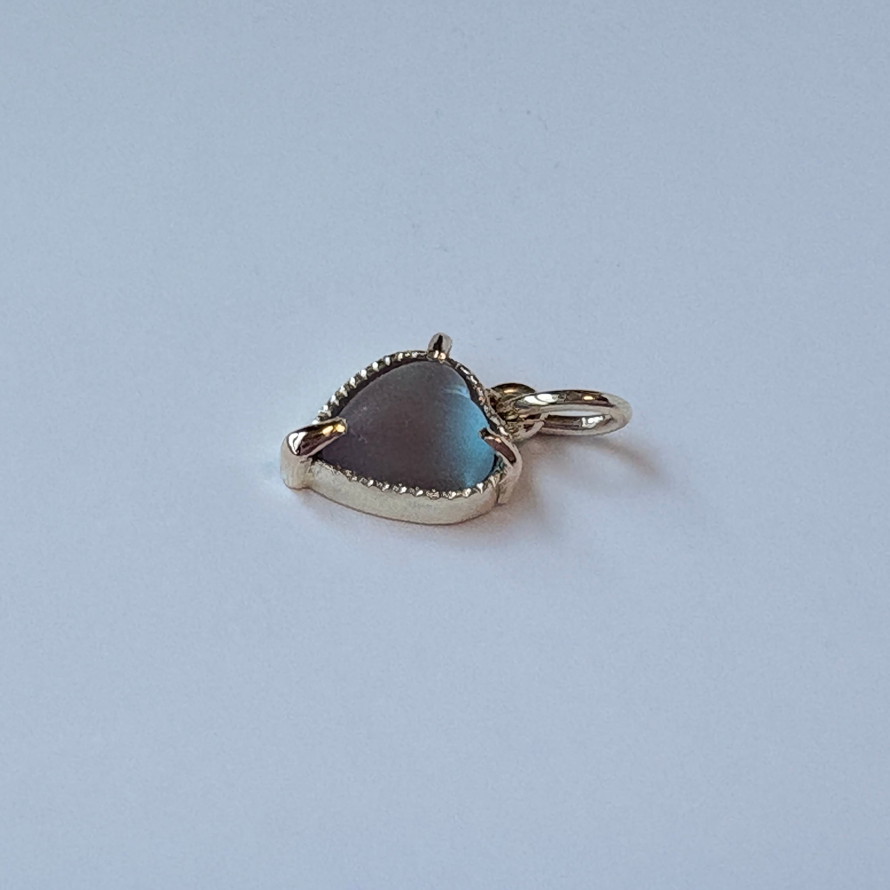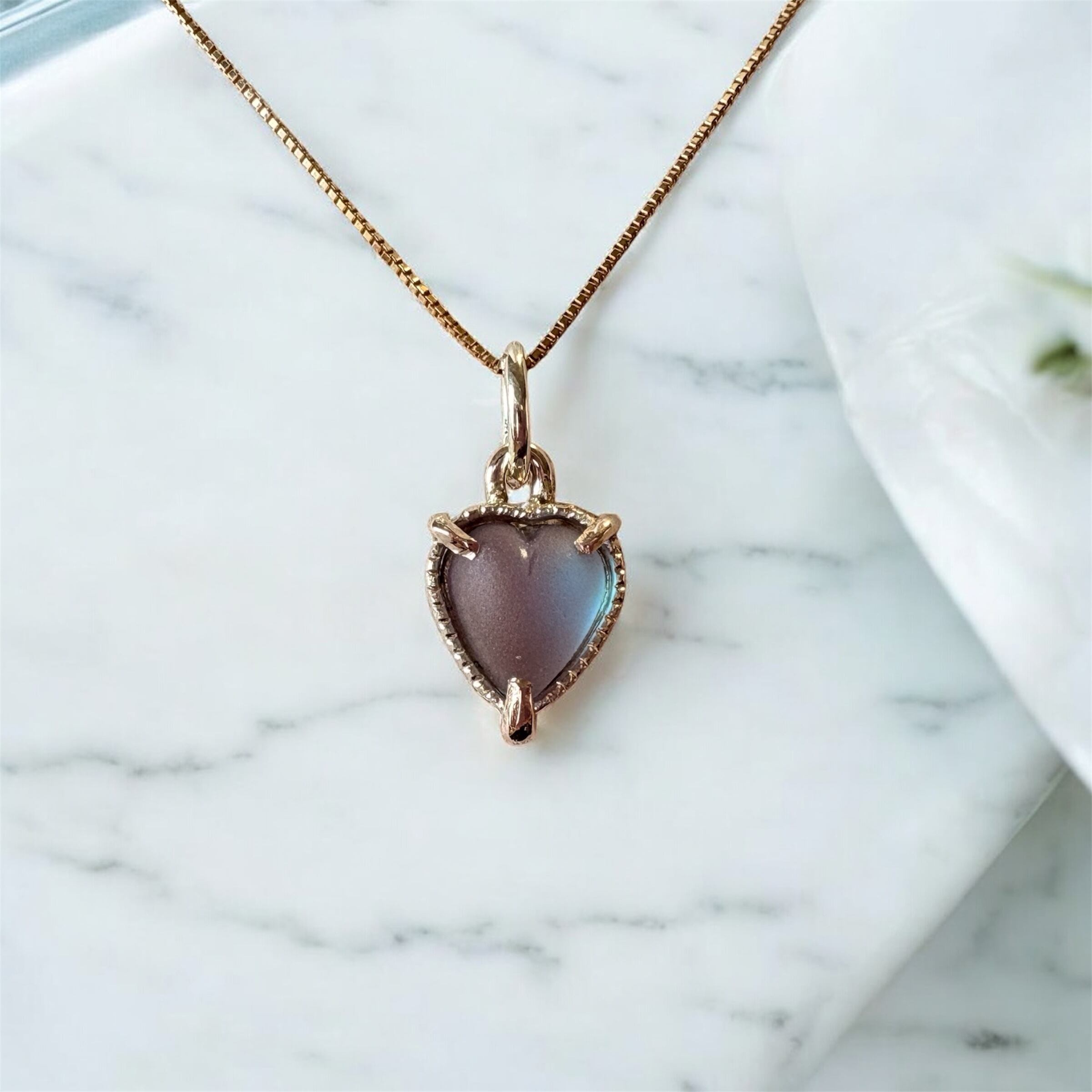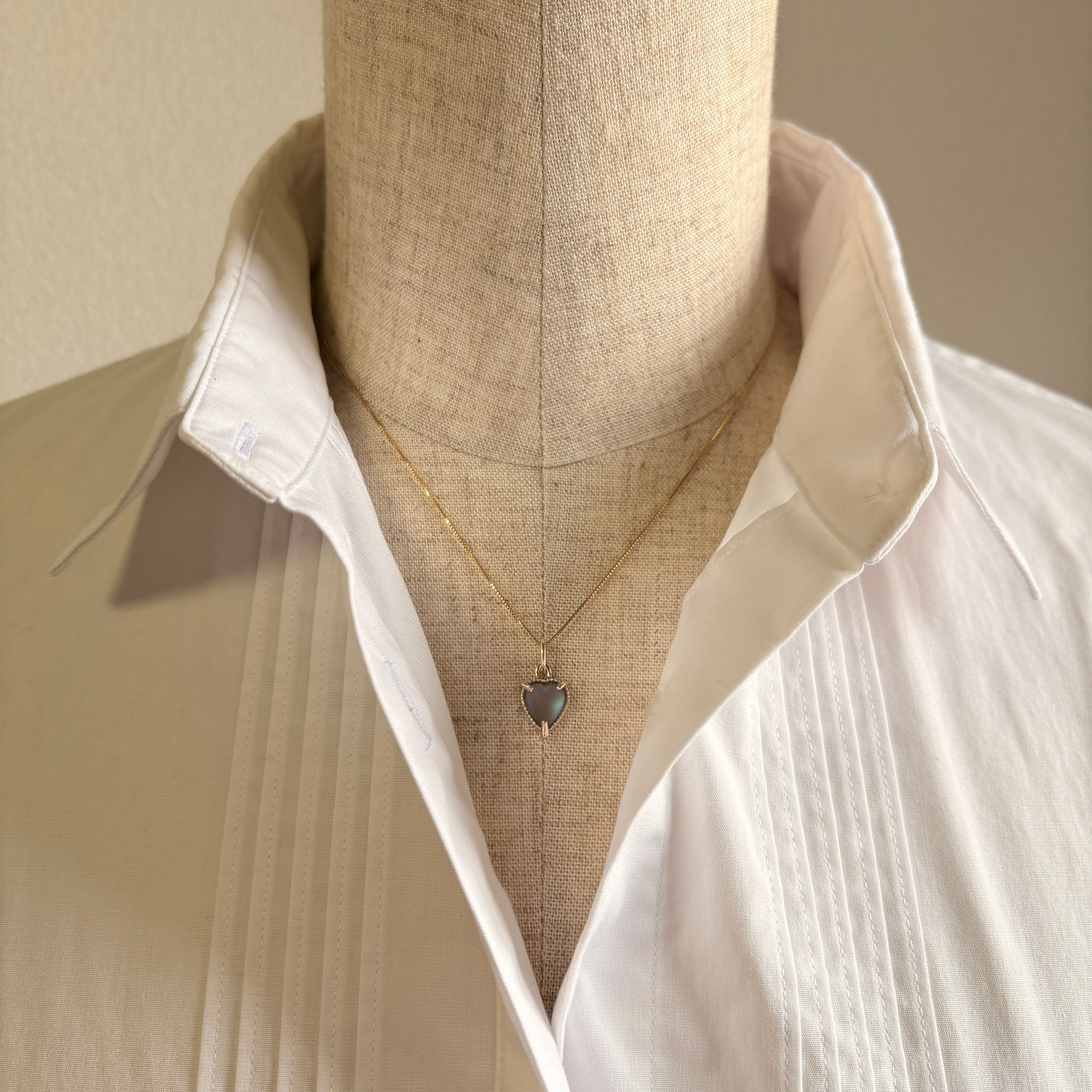 ハートのサフィレットはフロスト加工が施されており、ふっくらとしたカボションカットです。アンティークサフィレットなので肉眼でよく見ると小さな傷はございますが、ネックレスとして使用する際には気にならないかと思います。むしろ室内の暗めの場所でも青く光る、モーブブラウンとのコントラストが美しく目を引きます。
