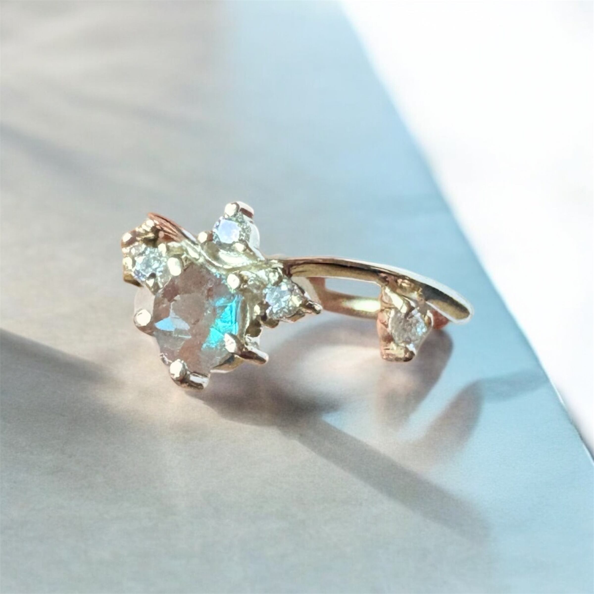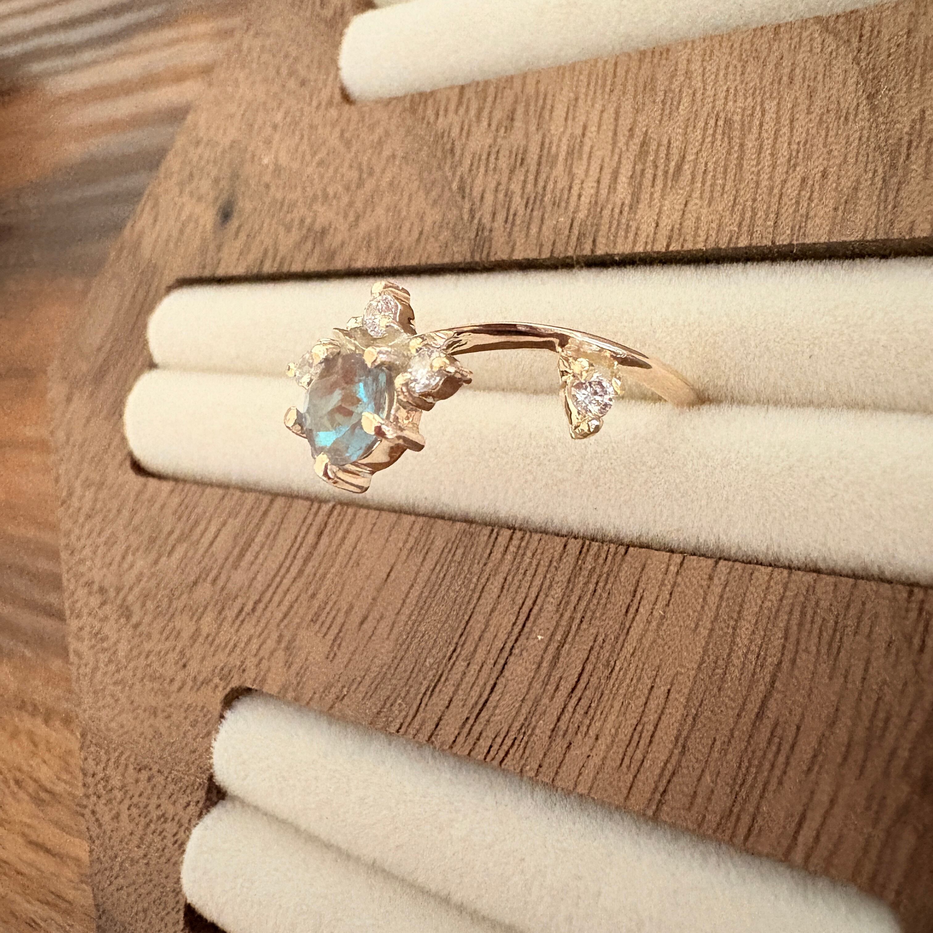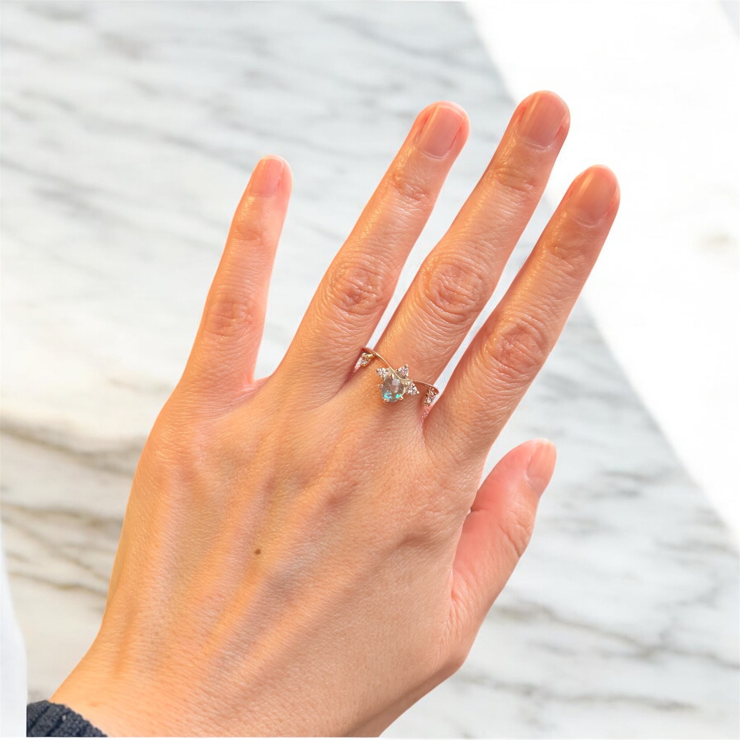 こっくりとしたココアブラウンから爽やかな明るいブルーの独特の色合いと、その神秘的な輝きが、いかにもサフィレットといった特徴で、指先を華やかに彩ります。