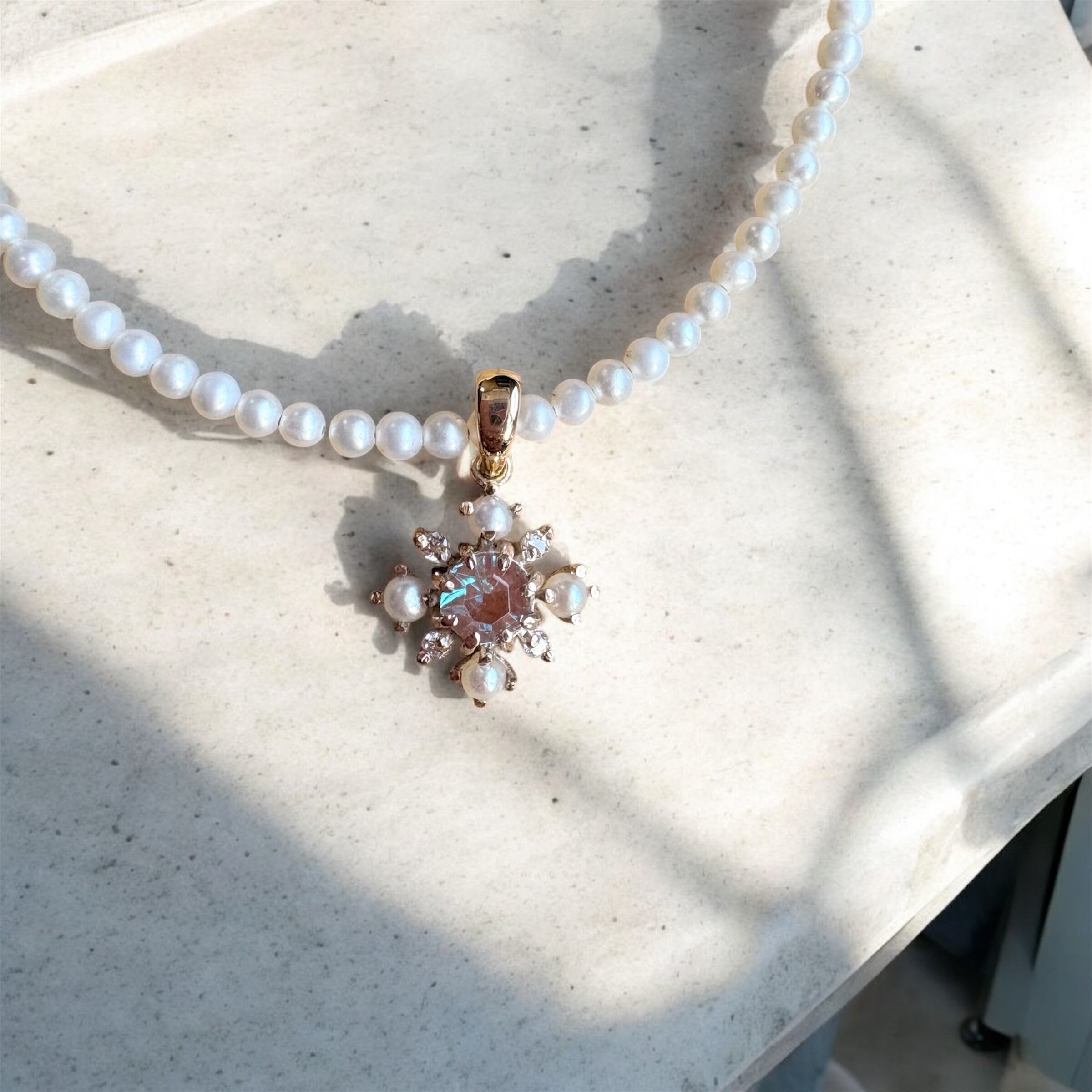 こちらのペンダントトップは、希少なサフィレットと小さな淡水パールを組み合わせ、大人の装いに仕立てました。サフィレット独特の深みのあるトーンとパールの白さが相まって、どこかアンティークシックな雰囲気です。